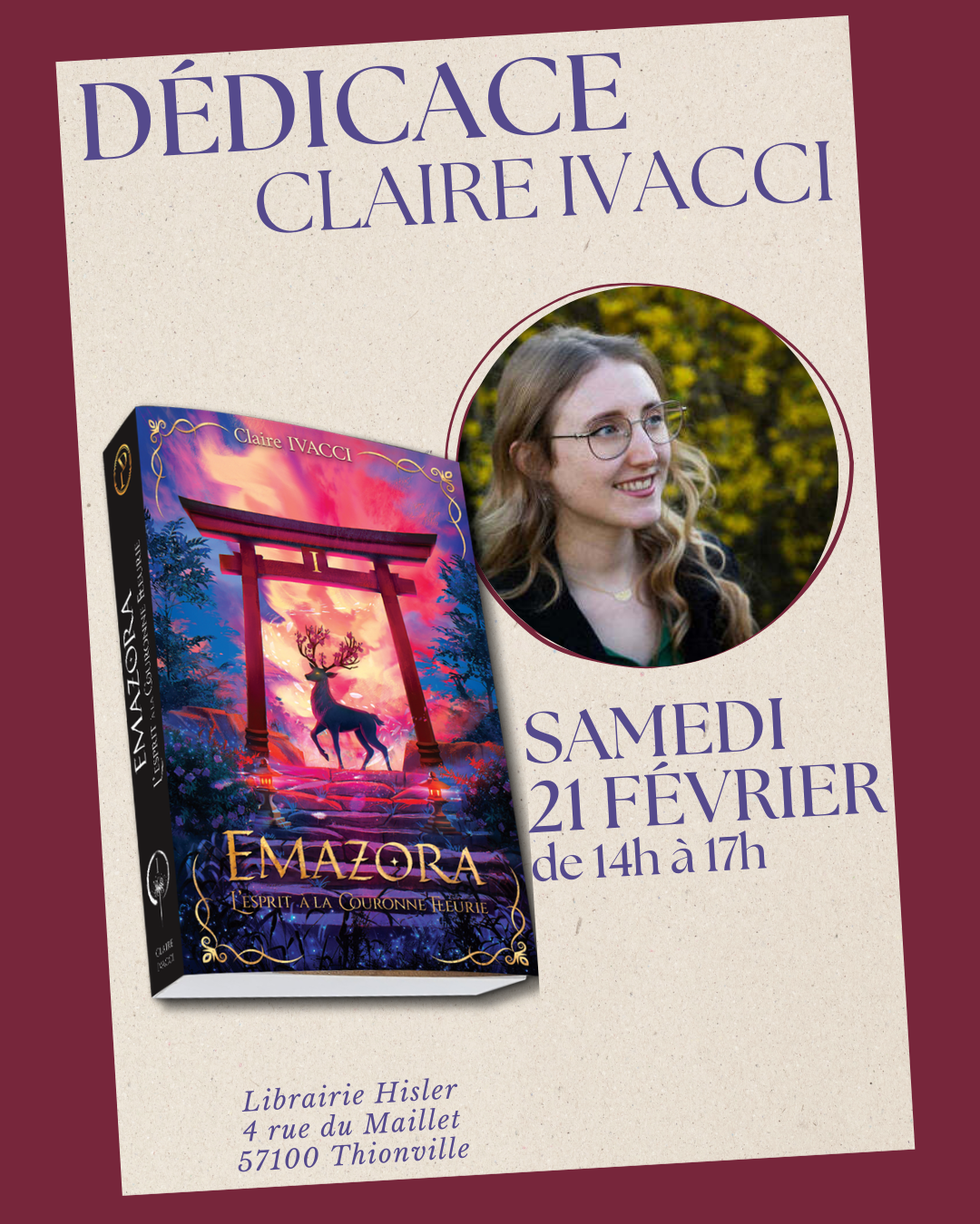 Le samedi 21 février de 14h00 à 17h00, la librairie Hisler de Thionville accueillera Claire Ivacci pour une séance de dédicace exceptionnelle autour de son roman Emazora – Tome 1 : L’Esprit à la Couronne Fleurie, publié aux éditions Pyrélion. Un rendez-vous incontournable pour les amateurs de fantasy, de romantasy et de légendes asiatiques.